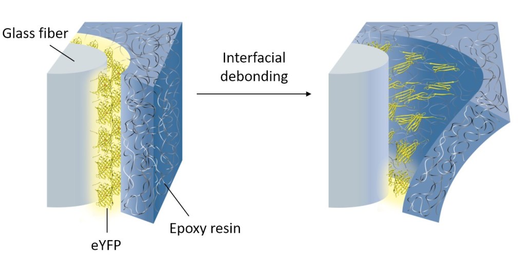 Mechanical forces and mechanical stimuli are an inherent part of nature, but their effect in controlling biochemical events has only recently been addressed in detail. Mechanobiochemistry is not only of relevance to understand processes in living systems, but it can also be a source of inspiration for the molecular design of novel materials with advanced properties. We have pioneered the force-induced modulation of photophysical properties of fluorescent proteins in polymeric materials in order to create materials that can self-report damage. For example, fluorescent proteins were conjugated onto glass and carbon fibers. These fibers were embedded into epoxy resin. The resulting fiber-reinforced composites could detect low velocity impact damage by a loss of fluorescent at the damage site. This allowed to visualize micron-scale damage such as fiber fractures and debonding at the interface of fibers and polymer matrix. The self-reporting system could find application as safety feature to detect barely visible impact damage in load-bearing composites or as analytical tool to monitor and characterize microscopic damage propagation in composites. Conceptually, the results demonstrate that mechanical forces can be transduced from materials to proteins if the proteins reside at an interface within the material, thus allowing to harness mechanically induced biochemical responses in a materials context.